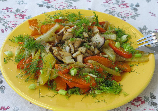 alles in schmale Streifen, in eine Form, Olivenöl drüber und würzen,