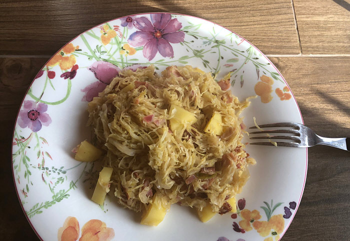 Sauerkraut dazu und köcheln lassen, bis Kartoffelwürfel gar sind,