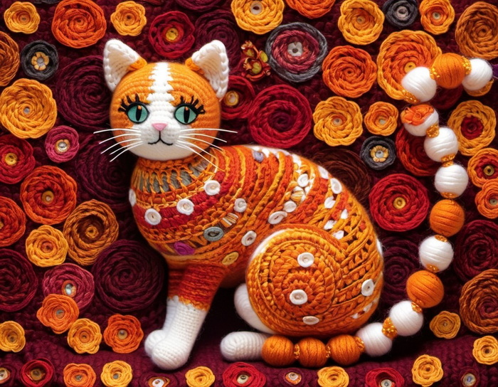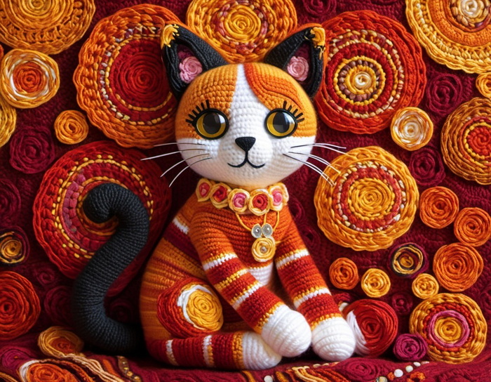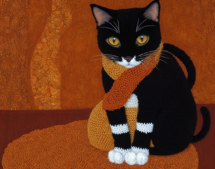 "gehäkelte Katze in schönen warmen Farben im Stil von Klimt"