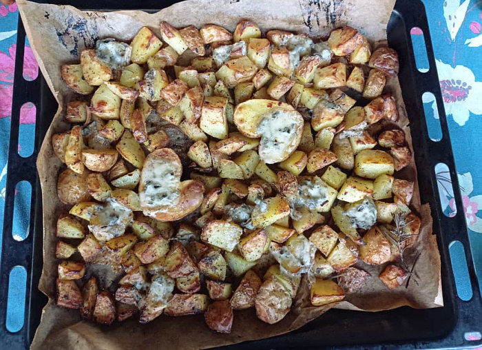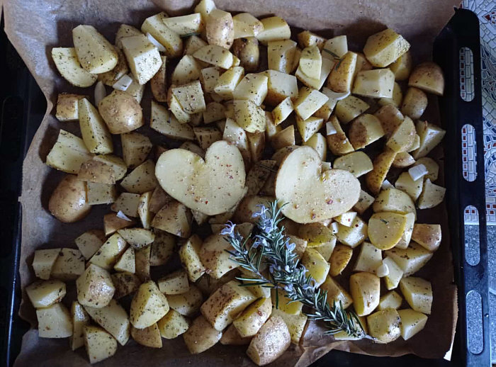 Auf dem Backblech verteilen und etwa 30-45min bei 200 Grad Heißluft garen.