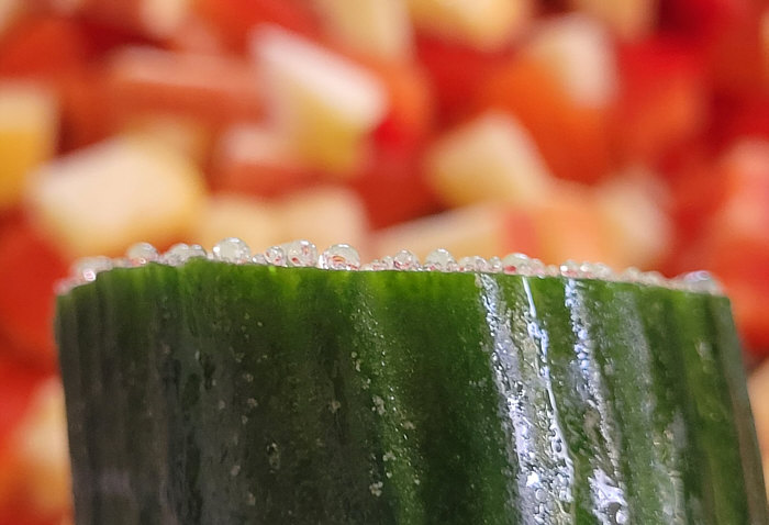 Hmm ... ist das Bild nun KI oder ein Foto ? Was meint Ihr ? Auflösung: das ist ein Foto ... Beate hat eine Gurke aus dem Kühlschrank genommen, in der Mitte durchgeschnitten ... und dann bildeten sich diese Tröpfchen. [Kommentieren]