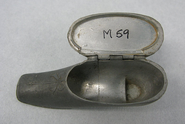 Das ist eine Schnupftabak-Dose in Schuhform. Länge: ca. 8 cm, Zinnlegierung, aus dem Jahr 1919. Zu finden im Auckland-Museum in Neuseeland. [Kommentieren]
