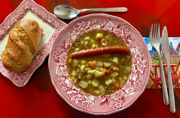 bei mir gibt es heute Linsensuppe mit Mettwürstchen und Brötchen.