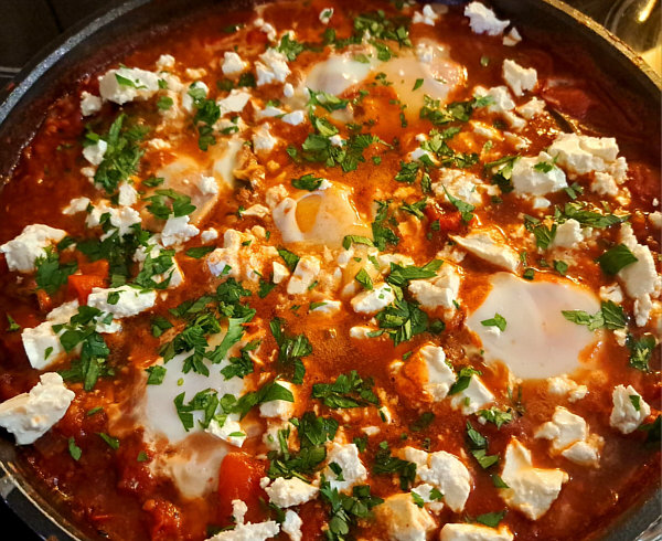 Feta und Basilikum auf der Shakshuka verteilen, Pitabrote dazu servieren.