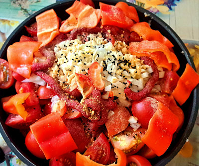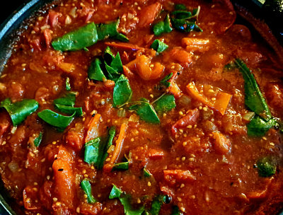 Tomatenpüree, Tomaten und Peperoni beigeben, ca. 5 Min. mitdämpfen, würzen.