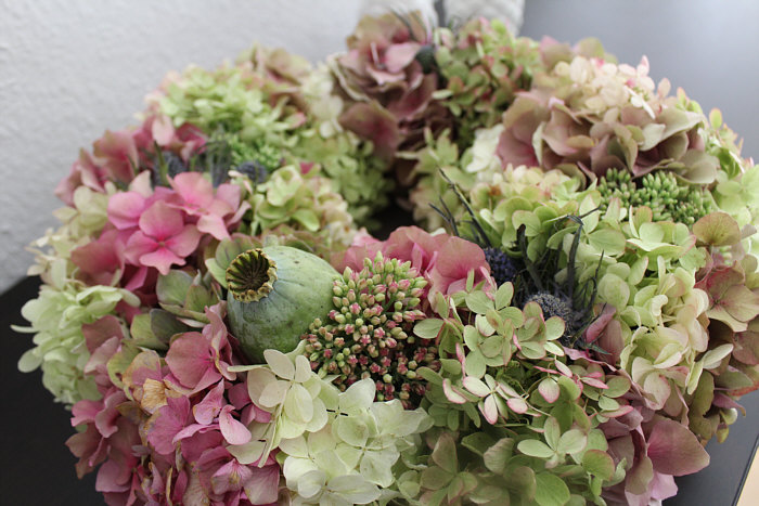 Man nehme einen Strohkranz, viele verschiedene Hortensienblüten,