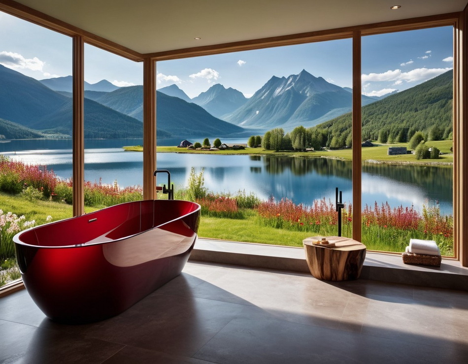 In der Mitte des Raumes steht eine dunkelrote freistehende Badewanne,