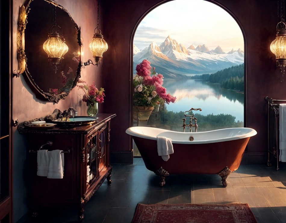 "Badezimmer mit Blick auf einen See und Berge im Hintergrund.