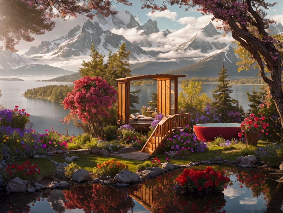 mit Blumen im Vordergrund und einem See und Bergen im Hintergrund."