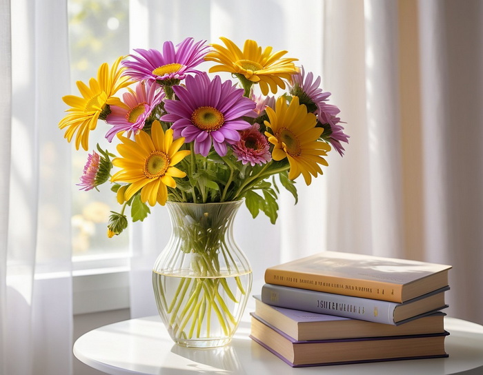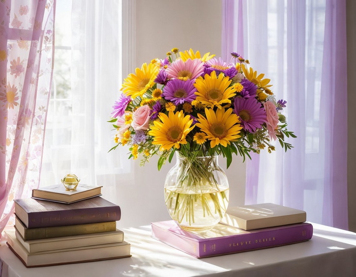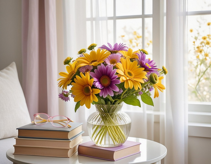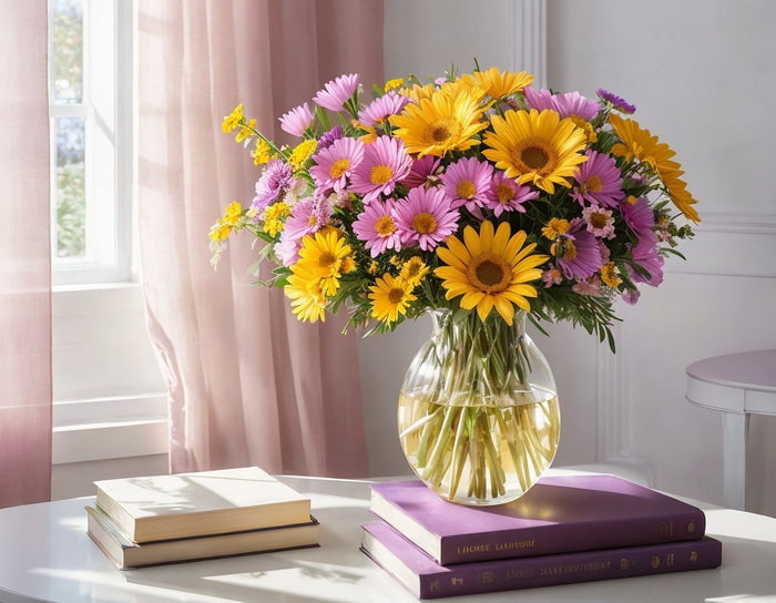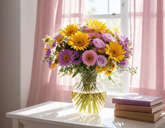Die Blumen stehen vor einem hellen, luftigen Hintergrund mit