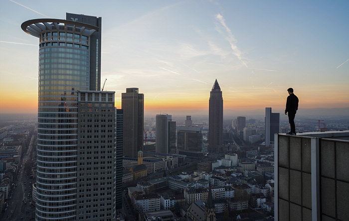Ein Rooftopper steht auf dem Dach des Winx Towers in Frankfurt am Main.