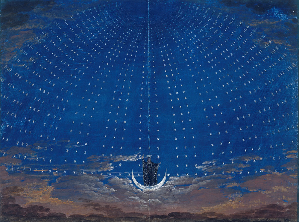 Die Zauberflöte. Oper von Wolfgang Amadeus Mozart. Im Jahr 1815 entwarf Karl Friedrich Schinkel dieses Bühnenbild. Für die Dekoration des zweiten Aktes ... wir sehen die Sternenhalle der Königin der Nacht. Kennst du die Zauberflöte ? [Kommentieren]