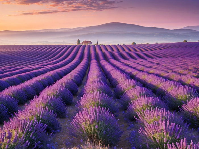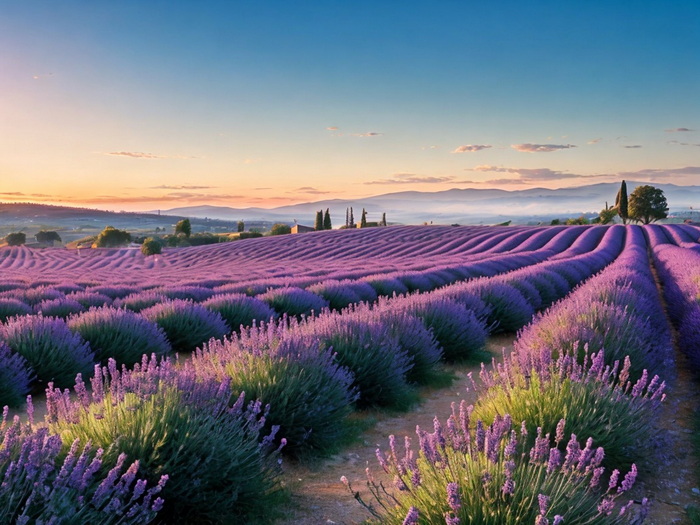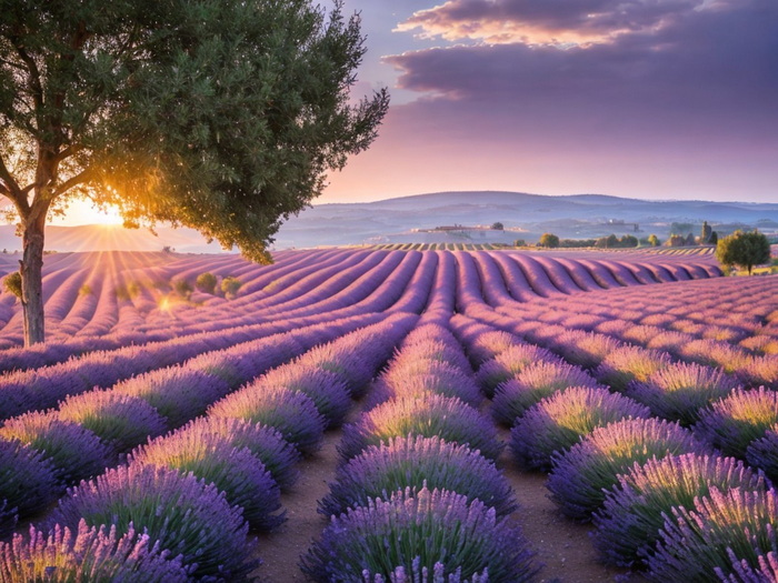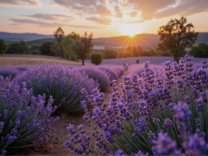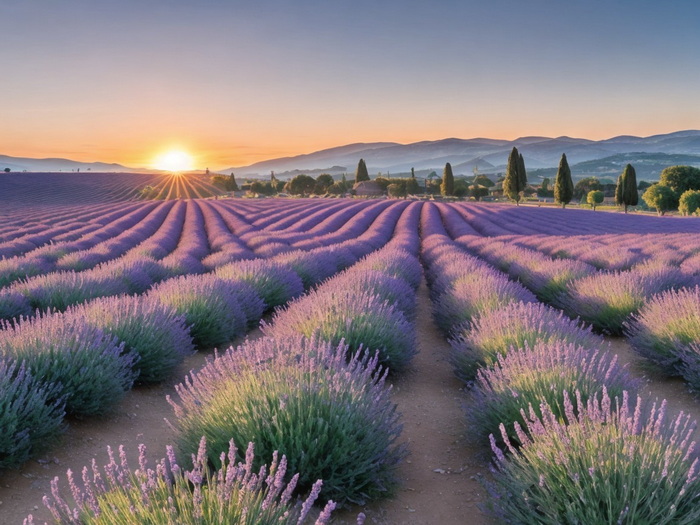 "Lavendelfelder in der Provence bei Sonnenaufgang."
