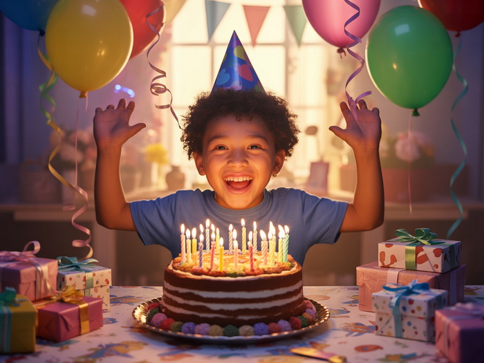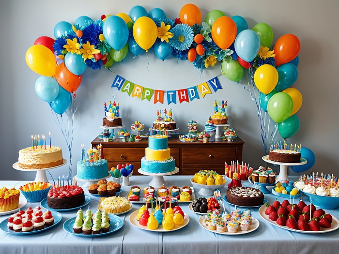 Fröhlichkeit, Dekoration in bunten Farben, Torten, Kuchen, Kerzen,