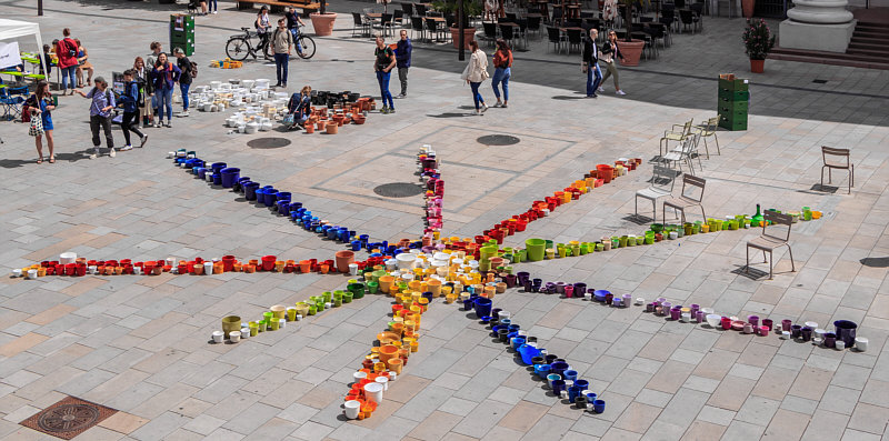 Aktion "Aus Abfall wird Kunst". Bodenkunstwerk mit aus dem Sperrmüll geretteten Keramikübertöpfen des studentischen Umweltkreises der Pädagogischen Hochschule Karlsruhe. [Kommentieren]