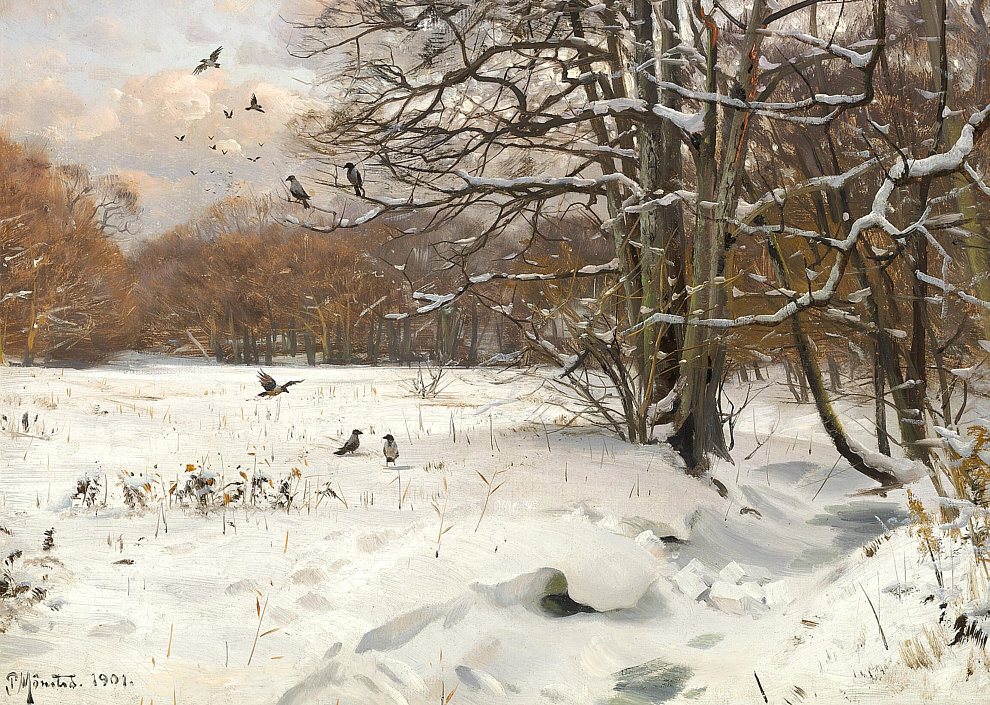 Peder Mørk Mønsted (Dänemark 1859–1941) - Wintertag mit fliegenden Krähen.