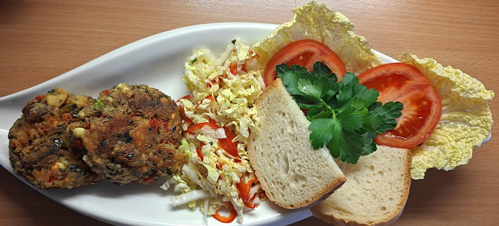 Leberkäse mit Röstikruste, Mischgemüse und grüner Salat