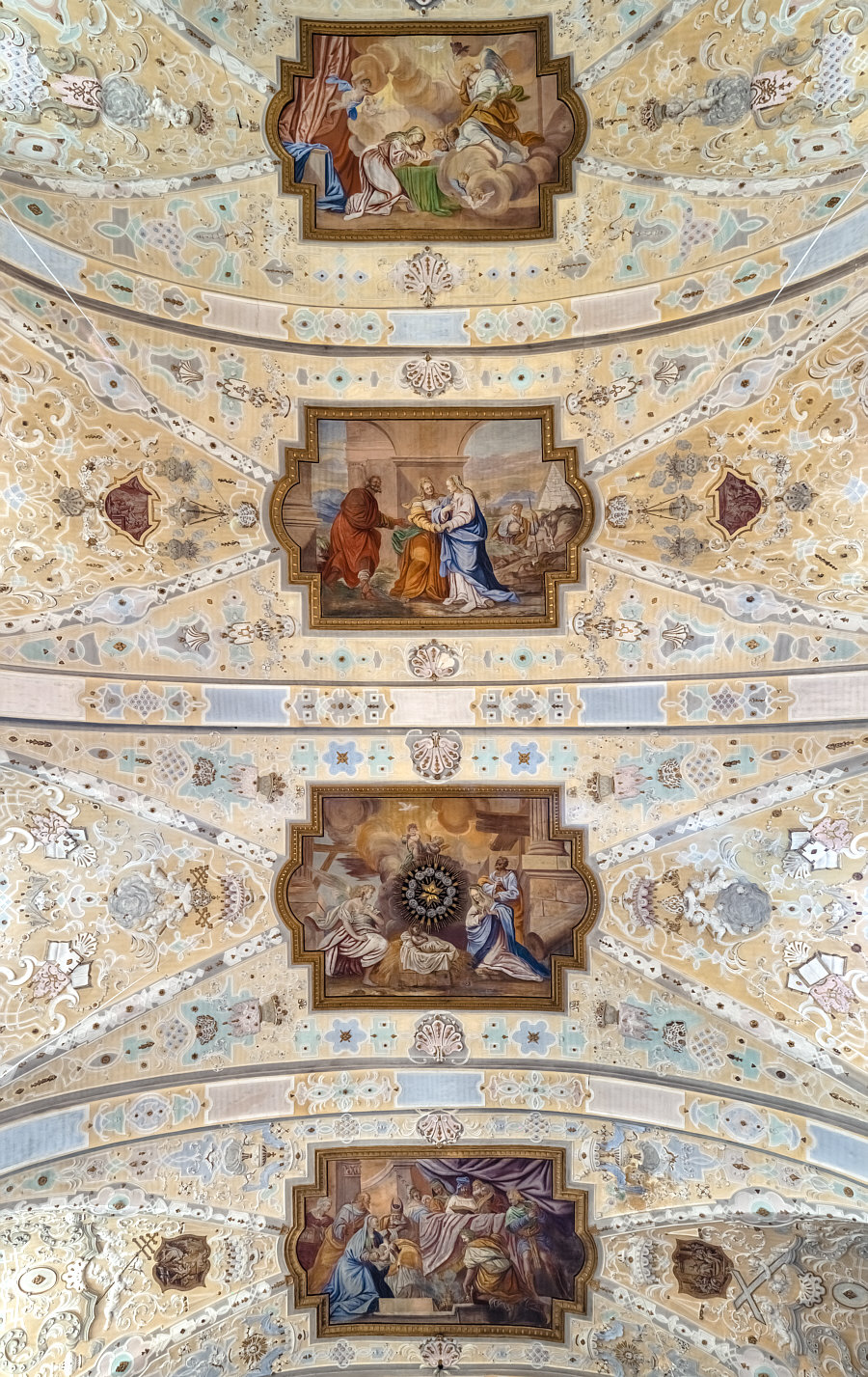Fotos: Ermell - Lizenz cc by sa 4.0 Das ist das Deckengemälde der Wallfahrtsbasilika in Marienweiher. Man muss sich mal vorstellen, das alles auf Gerüsten stehend zu malen. So, dass das ein solches Gesamtbild gibt. [Kommentieren]
