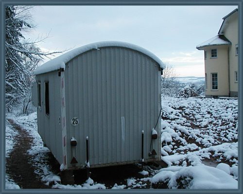 ein Bauwagen empfängt uns, als wir aus dem Wald kommen ...