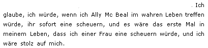 Menschen Menschen sind mißtrauisch Menschen sind egoistisch Menschen haben Angst, ihre Faust zu öffnen und die Hand zu reichen. Menschen können sich nicht fallen lassen Menschen können nicht vertrauen Menschen sind nie dem Vertrauen begegnet Menschen machen kaputt, was sie lieben Menschen sind schwach Menschen wollen stark sein Menschen brauchen selbst einen Halt Menschen dürfen nie aufgeben Menschen dürfen nie stehenbleiben Menschen sind müde Menschen stehen immer wieder auf Menschen versuchen, aus der Asche der Vergangenheit ein Haus zu bauen Menschen sind wie ich ... -- Musikduell --4-- Nachtrag zu gestern: wie ist mir peinlich *g*, bekam ich doch ein Lied zu hören aus einer CD, die ich selbst habe. Die sogar in der engeren Auswahl war, um einen Titel für Dich auf die CD zu machen. "Carly Simon" hatte ich übrigens mehr geraten, weil Du mal erwähntest, daß Du die Carly gut findest. Diese CD ("coming around again") habe ich mir wegen "itsy bitsy spider" gekauft und noch das geniale "hold what you've got" drauf gefunden. Spielt doch der Sean mir eine CD vor, die ich selbst habe, die ich gerne habe und ich erkenne den Titel nicht ... Und was bekomme ich heute serviert ? ein langsamer Titel, den ich überhaupt nicht einordnen kann. Keine Ahnung, wo ich das Lied hinstecken kann. Mir fällt nur auf, daß das Lied immer knapp an einer erwarteten Harmonie vorbeigeht. Es versteht, den Hörer immer wieder etwas ratlos zurückzulassen. Sean, Du überraschst mich heute morgen. Damit hätte ich nicht gerechnet. Ein ruhiges, sentimentales Lied, passend zu fortziehenden Regenwolken. Ich vermute mal, daß es eine Gruppe/Sänger ist, die normalerweise ganz andere Musik macht, wahrscheinlich Rock oder Hardrock. Und ich hier eine Ballade zu Ohren bekam, die mir wirklich gut gefällt. Sie ist genau das bißchen nicht stromlinienförmig, um nicht beiläufig werden läßt. ** und der Cowboy sitzt im Wüstensand und raucht seine Marlboro, als wolle er einen Werbefilm drehen. Und die Kreise seines Rauchs schweben langsam in den Himmel. Und seine Gedanken scheinen den Kreisen folgen zu wollen ... ** (der Titel war: The Doors, Crystal Ship) -- Mein Lied für Dich war heute etwas ganz anderes. "Laßt viele Männer um mich sein" könnte ich, was Musik betrifft, ohne weiteres sagen. Männerchöre mit vielen Stimmen können mich wegtragen. Ich kann Dir das phantastische Gefühl gar nicht beschreiben. Und hier sind es wirklich viele, viele Männer. Und ein ganz besonderes Lied dazu. Über 10 walisische Chöre haben sich zusammengeschlossen für das Lied "Myfanwy". Ich verstehe zwar die Sprache nicht, aber ich spüre die Tiefe des Liedes. Ein Lied, daß mich ganz innen berührt. Da darf mich auch gerne für sentimental halten ... -- gestern wieder in Lindenfels zur Kontrolle. Mit dem Schlaflabor könnte klappen, der Arzt will auf jeden Fall gegenüber der Krankenkasse nochmal bestätigen, daß wir beide eine Nacht unseren Schlaf überwachen lassen. Und 4 kg Fett habe ich abgenommen, bei 2 kg Gewichtsabnahme. Hätte ich nicht gedacht, daß ein solch positives Ergebnis herauskommt. Gibt mir Mut, weiter zu machen, sieben kg sind insgesamt unten, ich bin also schon bei fast der Hälfte der Strecke. Anschließend haben wir uns, das Wetter hat ja mitgemacht, noch einiges angeschaut. - die herrlichen Löwenzahnfelder im Odenwald während eines langen Spazierganges in Untermengelbach - Waldmichelbach - Schloßpark von Birkenau mit Pfauen, schwarzen Schwänen und großen alten Bäumen (Naturdenkmäler) - Naturschutzgebiet "Biedensand" in Lampertheim, Altrheinarm und Rheinufer -- Link des Tages: das Schweizer Gesundheitsportal -- Wort-des-Tages (aus meiner Mailingliste): Lieblingsbuch Wort-des-Tages gestern: wie war dein erster Kuß ? |