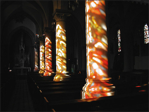 die Sonne nimmt die Farben der Kirchenfenster mit ihrem Strahl