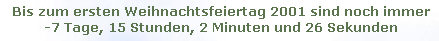 ![]() ![]() ich wünsche Euch Allen einen guten Start ins neue Jahr :) -- Link-Invasion heute (und das, obwohl die meisten wahrscheinlich im Stress sind ;). Bin ich im Stress? Ich könnt' jetzt sagen "ja, denn ich muss wieder aufräumen", aber das iss ja bei mir nix Besonderes mehr, da erzähl' ich ja ständig davon. Iss ja auch ständig Saustall bei mir und zu 90 % betrachte ich diesen und hoffe, dass durch diese Betrachtung sich eine wohlgeformte Ordnung in meiner heimeligen Dachwohnung einstellt. Aber das hat noch nie geklappt. Aber heute morgen wirklich Kopfhörer auf und ran ans Chaos. Die Musik wird aber heut' schon ein bißchen flotter sein müssen ;) (Play-List dann morgen). Danach hole ich Beate ab und heute abend werden wir uns auf einen Platz begeben, wo wir den ganzen Ort überblicken können. Und ich bin mir sicher, dass alle Bewohner von Bruchmühlbach extra für uns ein Feuerwerk machen werden *g*. Das war bisher jedes Jahr so, dass um 0.00 Uhr im neuen Jahr nette Menschen unsere Nacht erleuchtet haben. Ist doch schön, soviel Freunde zu haben ... *g*. And here the very much Links of today ... and if you have not soviel time to surf the links now, so remember that tomorrow and surf dann ... ;) -- Konfu berichtet von seinem 25stündigen Erlebnis im Superstau -- schöne Paris-Bilder bei Eva -- Google im Jahre 2001 [ via groggy ] -- gebt doch mal www.restaurantfuehrer.de in den Browser ein ... *lach* - auch wenns Missbrauch eines Domain-Namens ist ... [ via mcram ] -- Digital Art by Peter Fey [ via Heike ] -- malorama hat eine Seite ins Netz gestellt, auf der alle Bilder zu sehen sind, die in seinem Weblog im Jahre 2001 zu finden waren. Ein Muss ! -- und hier noch ein Link über Blogger und was dort passiert ist -- und in sieben Tagen feiern wir wieder ;) ![]() [ dieser Text ist mir heute morgen, 31.12.2001, Punkt 9 Uhr, im Netz begegnet ..., aber es sei verziehen, denn es gab einen schönen Adventskalender dort ] -- und es gibt wieder neue Hintergrundbilder bei mir (wie jeden Sonntag Abend) :) -- Wort-des-Tages (aus meiner Mailingliste): Silverster-Erlebnis / Raketen oder Böller |