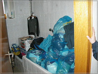 Badezimmer ... in der Wanne baden die Plastiksätze mit den Klamotten von Beate drin ... in der Dusche warten gemischte Kiste auf das kühle (oder warme ?) Nass ... und rechts die Hand, die gehört auch in die Wohnung und zu Beate ;) nächstes Bild