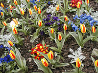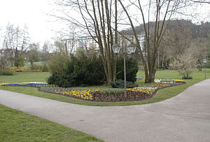 ein kleiner Kurpark, noch nichts grün und wenig Blumen. Das untere Bild täuscht, das war ein großer Pflanzkübel vor der Therme.