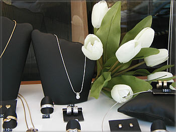 Tulpen umgeben von Schmuck ... leuchtendes Orange im Fenster ... [ beides natürlich nicht echt ] und ein Türgriff ... ... doch die Tür war verschlossen war ja auch Sonntag ;) und da war da noch eine Dame ...