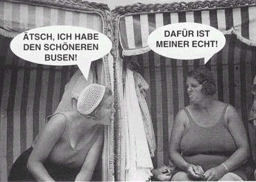 ![]() Liebe Sabrina, du holde Spam-Versenderin - es macht keinen Sinn, mir Mails zu schicken, die so aussehen: <body bgcolor="#993333" link="#0099FF" vlink="#0099FF" alink="#0099FF"> <p><b><font face="Arial" size="3" color="#FFFFFF">Mir macht es richtig Spaß mich so zu zeigen.</font></b></p> <p><b><font face="Arial" size="3" color="#FFFFFF">Schau rein</font></b></p> <p><b><font face="Arial" size="4" color="#0099FF"><a href="http://free.theporn.de/sabinchen/">Eingang</a></font></b></p> Du musst das als html-Mail schicken, damit man deinen Eingang auch finden kann. So kann man ja nix anklicken. Da wird das nichts mit den horizontalen Nebeneinnahmen via Dialer ... [ 5 Kommentare ] -- Achtung: frauenfeindlich ;)) ![]() wo landet man eigentlich, wenn man bei Google "schöner Busen" eingibt ? Platz 1: die Frauengalerie - sexy Lolita, geiler Po, Knackarsch, schöner Busen Platz 2: blowjob-fuck.de - über 120.000 unzensierte Sex-Kanäle rund um die Uhr, größtes deutschsprachiges Angebot im Cybersex, Sado, Dildo, Gay Platz 3: fickmaster - viele Cams und heiße Liebesspiele Tja, das Internet bestätigt mal wieder meine Vorurteile ;) ... ich habe dreimal nicht weitergeklickt ... [ 8 Kommentare ] -- Fotos des Tages: quadratisch, farbig wo schaust du hin ... [ 6 Kommentare ] -- empfehlenswert: der Verbraucher-Newsletter [ 0 Kommentare ] |