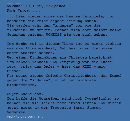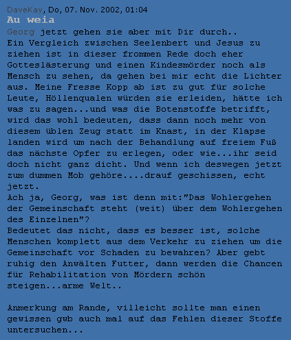 ![]() 2. Nachtrag: Kommentar von Ebola bei Kay ... ![]() Ich lasse das hier nur mal als Dokument unserer Zeit und als Teil der Diskussion stehen. Es tut mir für Georg leid, dass seine Worte gebogen werden und er solch unqualifizierte Kommentare bekommt. Und desweiteren ist es mir einfach zu blöd, zu dem Kommentar noch etwas zu schreiben. Meine Zeit ist mir zu kostbar dafür. [ 14 Kommentare ] -- Nachtrag: ich wollte zwar nichts mehr zu meinem unteren Text schreiben, aber nun habe ich das bei Dave-Kay gelesen: ![]() Ich geh da mal genau darauf ein, mache ich normalerweise nicht, aber hier kann ich mich mal gerade nicht halten. Dave-Kays Text in blau, meiner wie immer: Georg jetzt gehen sie aber mit Dir durch.. Ein Vergleich zwischen Seelenbert und Jesus zu ziehen ist in dieser frommen Rede doch eher Gotteslästerung ich sehe mich auch nicht in der Nähe von Jesus, gestatte aber Georg, das zu tun. Außerdem lese ich den Jesus als Metapher für die Botschaft. und einen Kindesmörder noch als Mensch zu sehen, da gehen bei mir echt die Lichter aus. Meine Fresse Kopp ab ist zu gut für solche Leute, Höllenqualen würden sie erleiden, hätte ich was zu sagen... lieber Dave-Kay, in diesem Falle wärest Du ein Mörder. Mit Deinem Maßstab gemessen hieße das: Kopf ab und Höllenqualen erleiden ... und was die Botenstoffe betrifft, wird das wohl bedeuten, dass dann noch mehr von diesem üblen Zeug statt im Knast, in der Klapse landen wird um nach der Behandlung auf freiem Fuß das nächste Opfer zu erlegen, oder wie...ihr seid doch nicht ganz dicht. Polemik ! Wir denken einfach nur nach, auch wenn Du das als "nicht dicht" hinstellst. Dass evtl. Botenstoffe eine Ursache für ein solches mörderisches Verhalten sein können, bedeutet ja nicht, dass die Mörder frei gesprochen und begnadigt werden. Ich bin strikt dafür, dass alle Maßnahmen getroffen werden, damit ein Mörder nie wieder seine Gedanken in die Tat umsetzen darf. Ja, auch wegschliessen. Wer hat den von begnadigen gesprochen ? Und wenn ich deswegen jetzt zum dummen Mob gehöre....drauf geschissen, echt jetzt. Ach ja, Georg, was ist denn mit:"Das Wohlergehen der Gemeinschaft steht (weit) über dem Wohlergehen des Einzelnen"? Hat da jemand widersprochen ?? Bedeutet das nicht, dass es besser ist, solche Menschen komplett aus dem Verkehr zu ziehen um die Gemeinschaft vor Schaden zu bewahren? Aber gebt ruhig den Anwälten Futter, dann werden die Chancen für Rehabilitation von Mördern schön steigen...arme Welt.. Arme Welt, lieber DK, ich habe gerade ein Stück davon lesen dürfen. Und ja, das war jetzt gerade auch Polemik. [ 10 Kommentare ] -- Wer sagt denn, dass ich das Opfer vernachlässige. Ich habe tiefes Mitempfinden mit den Angehörigen und verurteile die Tat aus Äußerste. Aber deswegen kann ich mich doch trotzdem mit dem Täter auseinandersetzen. Gerade heute morgen kam ein Bericht im Fernsehen, wo eine ehemalige Freundin des Täters interviewt wurde. Sie hatte sich von ihm getrennt, als sie sein Tagebuch gelesen hatte. Denn dort standen seine Phantasien, gequälte Kinder sehen zu wollen, drin. Und es geht doch Beides. Ich kann das als ganz schlimm empfinden, dass ein Mensch so ist, kann es für die Opfer als ganz tragisch empfinden. Aber ich kann, darf und werde mich auch fragen, warum der Täter diese Gedanken gehabt hat. Er hat ja nicht bei seiner Geburt beschlossen, so zu sein. Und es muss noch lange nicht in seiner Jugend oder im Elternhaus etwas passiert sein, das ihn so werden lässt. Es kann ganz einfach eine Störung in seinem Gehirn sein, wie auch immer geartet. Ich glaube nicht, dass ein Mensch willentlich zum Mörder wird. Sondern dass da neurochemische Vorgaben in seinem Gehirn ihn vor die Tatsache stellen, so zu sein. Da Mitfühlen mit den Opfern schließt nicht das Hinterfragen des Täters aus. Es ist halt leider nur nicht opportun, so zu sein. Muss ich erst laut des Opfers gedenken, bevor ich über den Täter nachdenken darf ? Es ist doch davon auszugehen, dass ich es als tragisch empfinde, was mit der Julia passiert ist. Was machen eigentlich Eltern, wenn sie erfahren, dass Ihr Sohn ein Kindermörder ist ? Mehr werde ich zu diesem Thema nicht schreiben. [ 13 Kommentare ] -- Stadt Land Fluss Tier Name Beruf Pflanze Schlucht [ sind diese Links eigentlich interessant, klickt da jemand drauf ? ] [ 4 Kommentare ] |
