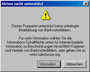 ![]() ich fasse es nicht !! Ich wollte gestern eine Banknote scannen. Weil ich dringend Geld brauche ?? Ja, das auch (wer nicht), aber mein Hauptanliegen war schon, das ich das Bild für eine virtuelle Gestaltung brauche. Und da allem Anfang ein Zauber inne wohnt, habe ich dann zum ersten Mal mit Photo Impact gescannt. Mit diesem Assistenten. Normalerweise kann ich das schon selbständig, aber ich wollte mal schauen, wie gut der Assistent assistiert. Also gescannt und warten ... und dann das: ![]() Woher weiß das Programm, dass das eine Banknote war, die ich gescannt habe ?? Hey, ich wollte mit diesem Scan nicht in der Bäckerei das viel zu teure Weihnachtsgebäck kaufen ! Auch keine Wurst, keinen Kaffee. Einen neuen PC, den ja, aber dafür reichen 50 Euro nicht ... Natürlich habe ich den Scan doch noch hingekriegt, man hat ja Alternativen auf der Festplatte ;) [ 11 Kommentare ] -- eine Aktion, die ich gerne unterstütze: ![]() [ 0 Kommentare ] -- Grausam - die Weihnachts-CD von Uschi Glas. Die Dame genauso bekannt wie unmusikalisch ... und dann noch der höchste Neueinsteiger in den Album-Charts ... 's iss halt Weihnachten ... Beate sagt gerade "wenn ich diese CD geschenkt bekäme, würde ich sie wahrscheinlich irgendwo vergraben". Und dann sagt sie noch frech zu mir "aber nee, dann würdest du ja sagen, man könnte die doch bei Ebay verkaufen" ;)) ... Recht hat sie ... doch Weihnachten findet dieses Jahr ohne die Uschi statt. [ 1 Kommentar ] |
