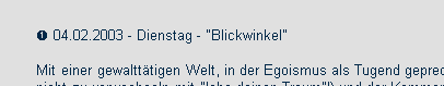 ![]() ![]() -- Gerade in den Nachrichten: "Die Bilder der Columbia, niemand wird sie so schnell vergessen" - Schmarrn, in zwei Tagen denkt ein Großteil der Welt nicht mehr daran. Schlimm, was da passiert ist, aber nicht schlimmer, als wenn bei einem Busunglück sieben Menschen sterben. Hier würden mich die Menschen, die gestorben sind, genauso interessieren. [ 4 Kommentare ] - Ich bin überzeugt, dass beim "Superstar" geschoben wird. Die Jury sorgt mit ihrer Ein wirklich guter Sänger war Nektarios. Und auch seine Version des Naidoo-Songs war top. Aber er wurde zu Unrecht negativ kritisiert und raus war er. Gestern: Juliette - gar nicht so schlecht, hat und noch die beste Stimme der Damen. Viel besser war natürlich die Judith, die freiwillig ausgeschieden ist (da würden mich übrigens die wahren Hintergründe mal interessieren). Gracia - na ja, schlechter als Juliette, aber besser als Vanessa. Die aber wurde zu Unrecht runter gemacht. Zumindest im Vergleich zum Daniel, der gestern wirklich grottenschlecht war. Mit Piepsstimme im Alter von 17 Jahren auf "my Way" zurückblicken ... das war wirklich 'ne Nummer zu hoch für ihn. Aber Daniel verkauft sich nun mal besser als Vanessa. Verkaufen im Sinne von Quote. Für Vanessa sitzen nicht Millionen vor dem Fernseher, für Daniel schon. Nix gegen Daniel, ich liebe ihn auch, aber gestern war er nun mal nicht gut. Wenn ich aber richtig liebe und wer auch der "Superstar" sein wird, ist der Alexander. Sieht gut aus, bewegt sich gut, singt gut. Und ist vor allem phänomenal zu vermarkten, dieser junge Mädchenschwarm, dieser Robbie Williams aus deutschen Landen. Es ist sowas von sonnenklar, dass es hier nur um Kommerz und Quote geht. Die Ausstrahlung eines Künstlers ist nichts wert, wenn man einen kantenlosen jungen Menschen besser verkaufen kann. Ich wünsche Nektarios von Herzen, dass er, auch wenn er nicht weitergekommen ist, seine musikalische Karriere machen wird. [ 7 Kommentare ] -- Was hat denn Google ![]() gestern gefeiert ? Den Tag des chinesischen Konfettischafes *g* ?? [ 4 Kommentare ] -- Und was feiern wir heute ? Meine Sonntagsupdates natürlich ;)): Bilder der Woche: in beiden Bildern findet man Äste ... Gedicht der Woche: bekam ich per Mail geschickt (danke sehr :)) ) und es war sofort klar, dass ich das als Wochengedicht bringe. HP der Woche: Da gerät man ins Träumen ... von den guten alten Zeiten ... die Tasten von damals ... Interview der Woche: Interessante Parallelen zum Interview vom letzten Sonntag. Beide Damen haben Google als Seite im Internet genannt. Und die Dame heute (danke für das Interview :)) ) wohnt nur 9 km entfernt von Uschi, die letzte Woche die Fragen beantwortet hat. Da könnte der Staffelstab für's Interview direkt zu Fuss vorbeigebracht werden ;). Zimmer mit Aussicht: Damenrunde mit blauem Blick auf Südeuropa. Schönen Urlaub und vergesst für ein paar den Winter hier :). Euch Allen einen schönen Sonntag !! [ 1 Kommentar ] |