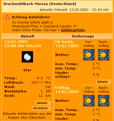 ![]() ![]() - Ich will Frühling !!! - Beate hat sich erkältet. - Autositzbezüge beim ALDI gekauft - im dritten ALDI, bei den ersten beiden war nix mehr, im dritten gab es nur noch eine Packung, aber genau die Farbe, die wir wollten :). Auf dem Heimweg dann in die Falle der Wegelagerer geraten *grrrummmelll*. Umleitung ... man ist überrascht, muss sich erst mal orientieren ... überlegt, ob alles ausgeschildert ist, wo man rauskommt und fährt mit rundumblickenden Hals durch ein Wohngebiet. Auto kommt entgegen und blinkt. Kennt der mich ? Hab ich Licht an ? Hmm, erstes weiß nicht und zweites nein. Bis ich dann am Wegelagererrand (wattnWort ;) ) ein Mann mit Kamera sehe, in die Eisen trete .... zuuuu spät. Ja, genau dort, wo Ausnahmesituationen herrschen, der unkundige, umgeleitete Verkehr durchfährt, lässt sich gut abkassieren. Ihr W...... :((. - Kennt Ihr Webshots ? - Ich kann Menschen, die "nicht" mit Geld umgehen können, nur empfehlen, einen Bogen um Ebay zu machen. Was es da alles gibt, man doch brauchen kann, gerne hätte und so billig ... ups, sind ja Euro und nicht mehr DeMark ... brauch ich das wirklich ... zuuuu spät ... Onlinebanking und nicht mehr drüber nachdenken ;). - Mails beantworte ich noch ... morgen, übermorgen ... - Es tut ein bißchen weh und ich stelle auch manche Worte in Frage, aber ich werde damit leben. Und ich werde nicht nachfragen. Ich werde nur "mich" fragen: wie offen sind die Menschen ? Wie offen bin ich ? - Mir ist die Zeit fortgelaufen ... ist sie bei Euch ?? - Ich will Frühling, oder sagte ich das schon ?? ;) ... wenn ich so durch die Logs surfe, sehe ich bei Sabine + Mo ![]() Ingrid ![]() bei Tatjana ![]() sind sich drei einig: Liisa, Elvi und Wapiti: ![]() ![]() ![]() kein Wunder, die Temperatur wird ja auch bei allen Dreien in Stuttgart gemessen ;). Deswegen habe ich das Wetter auch nicht auf meiner Seite, denn wetter.com misst die Temperatur für meinen Ort in Idar-Oberstein und das ist eine ganze (große) Ecke entfernt und eine ganz andere Klimakategorie. Der Beweis: ![]() oben (in der organgenen Grafik) der Ort, wo ich wohne und unten "aktuelle Wetterdaten aus der Region Idar-Oberstein. Und nun zum Routenplaner: ![]() Kaum zu glauben, wetter.com misst das Wetter für uns in 70 km Entfernung. So wird das nüscht mit dem Wetter hier im Tagebuch. Kann da mal nicht jemand eine Wetterstation in die Nähe bauen ... [ 6 Kommentare ] |