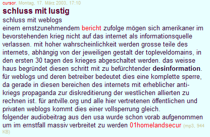 ![]() Zweiter Eintrag für heute - mich juckts in den Fingern ... Vorkriegssplitter: Als heute nachmittag das Internet für sechs Stunden (bis eben) ausfiel, dachte ich zuerst, dass mit meinem PC etwas nicht stimmt. Oder das sich jemand (mal wieder) mit meiner Nummer einwählt. Und dann kam unweigerlich der Gedanke, ob irgendwo ein Flugzeug drauf gefallen ist ... so weit sind wir schon, der Krieg wirft seine dunkelroten Schatten voraus. [ 8 Kommentare ] -- Was würde passieren, wenn alle Regierungschefs der EU (bis auf Spanien und GB natürlich) nach Bagdad fliegen und sich dort im Palast von Saddam aufhielten. Würde Amerika trotzdem angreifen ? [ 4 Kommentare ] -- Wie weit ist Bush von Hitler weg ? Wie weit war Bush vor einem Jahr von ihm entfernt ? Um wieviel ist er inzwischen näher gerückt ? Das kann man nicht vergleichen !! ?? [ 6 Kommentare ] -- 71 % der Amerikaner sind der Meinung, dass die Diplomatie am Ende ist und es einen Krieg geben sollte. Wieviel Prozent waren es vor knapp 70 Jahren ? [ 0 Kommentare ] -- Der böse Deutsche, der dies in den Augen der Amerikaner immer bleiben wird. Propaganda, die nie leiser wird. Und vor der Haustüre liegt meterhoch der Dreck ... [ 3 Kommentare ] -- hier dieses gelesen: ![]() Normalerweise kann es ja sowas nicht geben, aber ich glaube heutzutage an alles ... [ 4 Kommentare ] -- Heute gehört: eine Firma bei uns in der Nähe bekommt einen Nachfolgeauftrag aus Amerika nicht mehr ... [ 0 Kommentare ] -- Ingrid hat das Thema aufgeworfen, dass damals am 11.9. die Blogs/Tagebücher "begutachtet" wurden, ob sie auch genug betroffen sind. Und ob das heuer so wieder sein wird ... berechtigte Frage ... Ich für meinen Teil beantworte die Frage so: es ist mir egal, wie betroffen ich sein soll. Ich werde wütend sein, wenn ich das will. Und ich werde Frühlingsgedichte posten, wenn mir danach ist. Die Zeiten, in denen ich so funktioniert habe, wie es der geneigte Wunsch meiner Umwelt war, sind längst vorbei. Tagebücher sind Aufzeichnungen, in denen der Schreiber von sich erzählt. Von seiner Meinung, seinen Gefühlen. Wer hat da etwas zu kritisieren ? Niemand. Punkt ! [ 8 Kommentare ] -- Es wird keine Welt untergehen, wenn es Krieg gibt. Für "uns" nicht ... Das Leben wird weitergehen, die Brötchen morgens in der Ladentheke abkühlen ... nur die Bildzeitung wird endlich keine blutigen Geschichten mehr erfinden müssen, sondern einfach nur Nachrichten abdrucken. Ich selbst lasse mir meine gute Laune, so ich die gerade habe, nicht von der Sternchenflagge nehmen. Soweit kommts noch. Und wenn ich weinen will, werde ich das tun. Und wenn ich wütend bin, dann wirst es du, mein geheiligtes Tagebuch, abbekommen. Aber du kennst mich ja und kannst das einschätzen ;). Eines werde ich auf jeden Fall nicht tun: mich dem 24-Stunden-Kriegs-Dauerbeschuss des Fernsehens aussetzen. [ 6 Kommentare ] -- Ob Bush heute froh ist, dass es den 11.9. gegeben hat. Eine besseren Grund, seine Kriegslust auszuleben, kann man sich doch gar nicht vorstellen ... [ 6 Kommentare ] |
