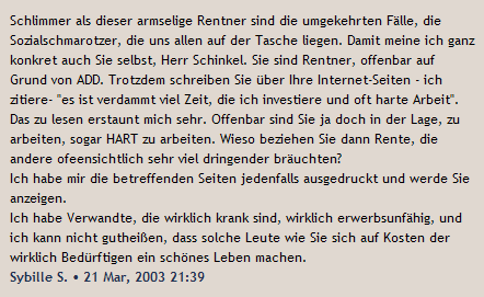 ![]() Gerade eben hinterließ eine E-Mail-lose Sybille S. folgenden Kommentar (es ging um das Thema des Rentners, der von seiner Sozialhilfe sich Geld angespart hatte ... ![]() Ohne weiteren Kommentar, nur richtigstellend, dass ich nicht wegen ADD, sondern wegen Krebs, Hepatitis B, Leberzirrhose usw. Rente (auf Zeit) habe. Verehrte Frau S., ich wünsche Ihnen, dass Sie gesünder sind und bleiben als ich und eine längere Lebenserwartung haben. [ 32 Kommentare ] |