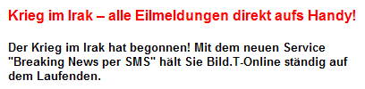 ![]() ![]() [ 2 Kommentare ] -- 75.000.000.000 $ hat Bush für den Krieg beantragt. Für sechs Monate. Eine Ausbildungspatenschaft für ein Kind in Afrika kostet 25 € im Monat, 150 im halben Jahr. 75.000.000.000 $ sind 70.555.032.926 € Von diesem Geld könnte man 470.366.886, also 470 Millionen Kindern eine Patenschaft finanzieren. Aber man kann das Geld auch besser einsetzen: - unbescholtenen Zivilisten das Leben beenden - mal schnell einen britischen Tornado abschießen - 'ne Handgranate auf die eigenen Leute werfen - ein iranisches Öllager bombardieren - einen Bus mit syrischen Zivilisten bombardieren - Cruise Missiles in die Türkei fallen lassen - zwei eigene Hubschrauber zusammenstoßen lassen was solls, 's ist ja Krieg ... [ 8 Kommentare ] -- Ich glaub nur die Hälfte von dem was ich sehe und es wird immer weniger, wo ich überhaupt hingucke ... [ 5 Kommentare ] -- Liebes Land im nahen Osten. Ich greife Dich jetzt an und töte Menschen, die in deinen Städten leben. Solltest du wider Erwarten ein paar meiner Leute gefangen nehmen, dann denke bitte an die Genfer Konvention und behandele sie ordentlich. Ich greife dich schließlich auch ordentlich an. Nach der Washingtoner Konvention. [ 5 Kommentare ] -- Einer der besten Schätze, die das Internet ans Tageslicht gezerrt hat, bloggt nun auch :)) [ 5 Kommentare ] -- Fotos des Tages: Mama, Mama ... Abendimpression was hängt denn da ? [ 5 Kommentare ] |