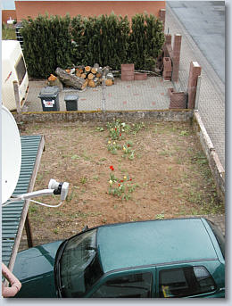 Direktlink![]() [ 1 Kommentar ] -- Ich würd' ja gerne aufzählen, wer noch alles inzwischen so fotobloggt. Aber so langsam verliere ich die Übersicht ;). Auf jeden Fall sind jetzt auch dabei: Ingrid, Tina, Ulla, Orlando, Michael, Das Problem ist nur: wir haben alle keine Zeit und machen es trotzdem *g*. Ich natürlich auch ;)) Und was lassen wir dafür schleifen ? Mal sehen *g* - vielleicht lernen wir es ja, doppelt so schnell zu leben, während die Zeit im gleichen Tempo weitergeht. Jetzt fehlt nur noch die Webcam bei allen und ein zweites anonymes Log, um die dunklen Seiten auszuleben. Aber die hat ja keiner von uns ;). An einer Webcam hätte ich ja schon lang Interesse, aber ich sitz' ja ab und zu essend, rauchend, trinkend, Grimassen ziehend und mit abstehenden Haaren hier. Kneife ein Auge dabei zu (ein altes Leiden von mir, wenn ich mich optisch auf etwas konzentriere), das würde dann Bilder geben ... nee nee ... Aber statt Webcam gibts den aktuellen Blick von heute morgen aus dem Fenster, das zur Strasse geht: ![]() Ab dieser kleinen Mauer vor den Mülltonnen ist Nachbargrundstück. Holz, Tonnen und Wohnwagen gehören also nicht uns. Dafür aber Schüssel, Auto und Carport. Der Garten in diesem Teil ist eigentlich unbepflanzt, weil da ein Doppel-Carport hin soll, aber die schon seit alten Zeiten dort drin steckenden Tulpenzwiebeln sind dieses Jahr, trotzdem da im Herbst der Bagger drüber ist, wieder treu gekommen. Die werden natürlich gerettet, bevor der neue Carport dort hin kommt. Links um die Ecke ist irgendwo Beate im ihrem Element. Nicht Feuer, Wasser oder Luft, sondern Erde ... Gartenerde :). [ 4 Kommentare ] |
