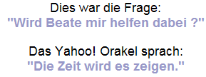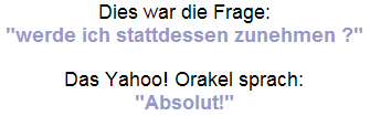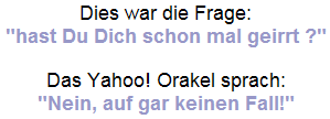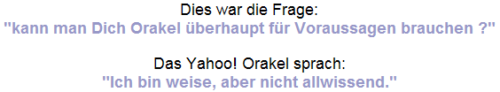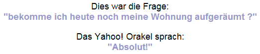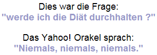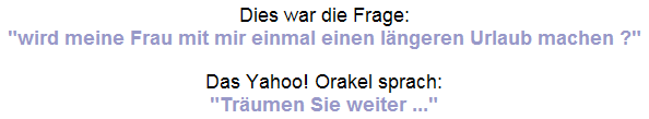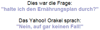 Direktlink![]() [ 10 Kommentare ] -- erst aufräumen, dann Tagebuch schreiben .... stand heute Mittag da, ich hab auch damit begonnen, musste aber doch mal kurz unterbrechen *g* ... [ 16 Kommentare ] -- Ich glaube ja nicht so richtig an Orakel im Netz ... bis heute ... aber das Yahoo-Orakel, ich werd' verrückt ... doch der Reihe nach: heute morgen lachte mich eine rote 113,7 auf der Waage an und wir haben, bereits länger geplant, auch ab heute angefangen, unsere Ernährung umzustellen und wollen abnehmen. Also frage ich das Orakel: ![]() Na denn, warum fange ich überhaupt an *grummel* ... Beate stellt die gleiche Frage: ![]() upps, auch nix ...also kämpfen wir nicht nur gegen unseren Schweinehund, sondern auch gegen das Orakel ;)) PS: taugt das Orakel überhaupt etwas ? Fragen wir es doch mal: ![]() ok, wenn Du weise bist, dann beantworte mir doch mal: ![]() na, das sind ja Aussichten ... kommen wir, wenn wir schon dabei sind, zu einer anderen wichtigen Frage. Die mit dem Urlaub. Beate ist ja ein Haus- und Hofmensch, ich ein Fortfahrmensch. Träumend vom Urlaub, südlichen Seen und grünen Inseln. Wird mein Traum wahr ? ![]() tja ... wenden wir uns besser den naheliegenden Dingen zu: ![]() na wenigsten dass ! Alleine, liebes Orakel ? ![]() mmh, mal abwarten, mache auch gleich weiter in meiner Wohnung ... und nun noch die letzte Sicherheitsabfrage an das Orakel: ![]() ...--> ohne Worte <--... [ 9 Kommentare ] -- Fotos des Tages: Krone in blau das vergessene Bild zwei Garagen [ 2 Kommentare ] -- Das Wochenende ist vorbei, wir waren nicht vor der Tür und ich war fast nur am fotobloggen. Ist aber überhaupt nicht langweilig geworden. Man konnte ja fast stündlich neue begrüßen. Mittlerweile bloggen (alphabetisch sortiert - daneben der Link zum TB oder zur HP) (der Server dort lahmt öfters mal, also einfach später nochmal probieren ... die wollen auch auf einen neuen schnelleren Server umziehen): Altweibersommers Fotolog ( Fett-weg-Tagebuch ) Connys Fotolog ( Conny Gedankenwelt ) Curiosity killed the cat ... Tinas Photolog ( Gedankenschnipsel ) Elvis Fotolog ( Nanu ) Fotolog im Mondscheinportal ( Elkes Tage- und Mondscheinbuch ) Ingis Strandgut ( Strandgut ) Kho's Fotolog ( Kho's Weblog ) Komm in meinen Garten ( Tage wie diese ) Liisas Fotolog ( Litkara Weblog ) Limones Fotolog ( Limones Blog ) Mikres Fotografies ( Imerologio ) Mobas Hamburg + Notabenes Fotolog ( Notabene ) Olivers Fotolog ( Stör-Signale ) OPPInion ( Oppis World ) Orlandos Fotolog ( M O Blog ) Pias Fotolog ( Jeden Tag ) Piris Fotolog ( Forum40 weiß jetzt aber nicht, was Piri genau mit dem Forum zu tun hat ) Rastapunzels Fotolog ( Rastapunzels Turmzimmer ) Schau mit meinen Augen ( das kanadische Journal ) Soulcolors ( ALLEs allTÄGLICH *g* ) Sylvies Fotolog ( Nachtbuch ) ich hoff, ich hab' niemand vergessen ... es ist schwer, die Übersicht zu behalten ;) - einfach melden, ich trage den Link dann nach ... ein paar interessante internationale gibts morgen oder übermorgen ... PS: so einige von Euch fehlen noch ... anmelden, noch ist der Hype da :). [ 6 Kommentare ] |