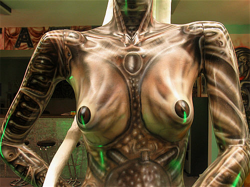 Diese Dame soll einladend wirken auf die Passanten. Damit diese entzückt sind und sofort in dieses Tattoostudio gehen. Leider war es Nacht und das Studio hatte geschlossen, so dass ich immer noch tattoofrei bin ;).