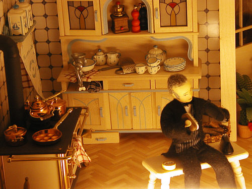 Dahinter ein rustikales Küchenbuffet aus alten Zeiten, auf dem Herd